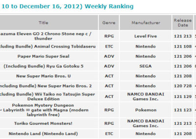 Week 2 sales numbers for RGG5. Moved down a few slots this week. Can’t compete with Nintendo games or Soccer RPGs.